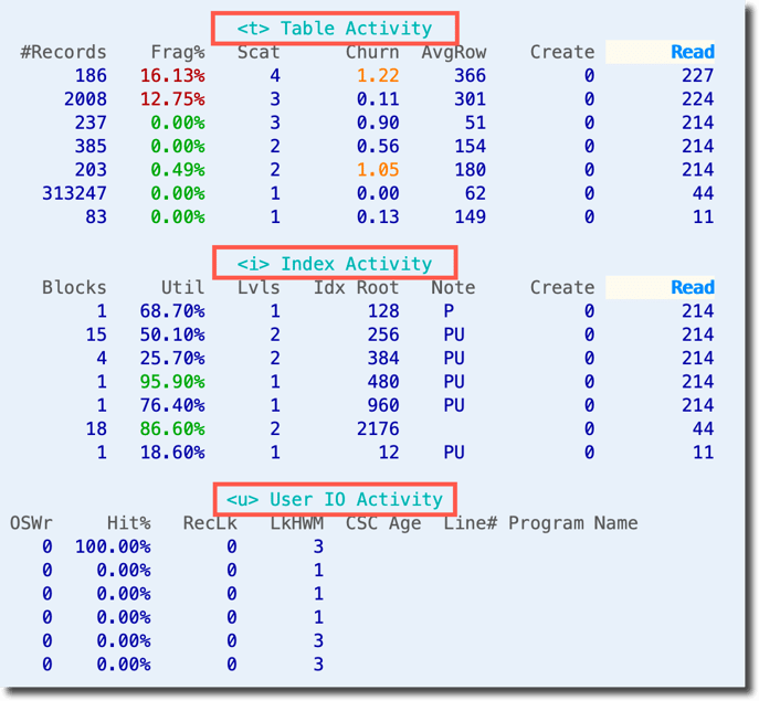 Last Keystroke accepted ("u" in black above) Keystroke History (in green) Green history means ProTop RT is accepting keystrokes, red means processing. How long RT waits for keystrokes is controlled in etc/protop.cfg by the realTimeMinDelay parameter. |