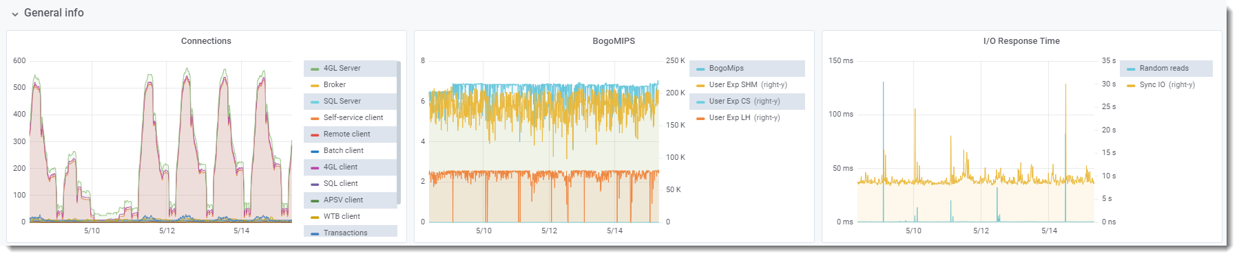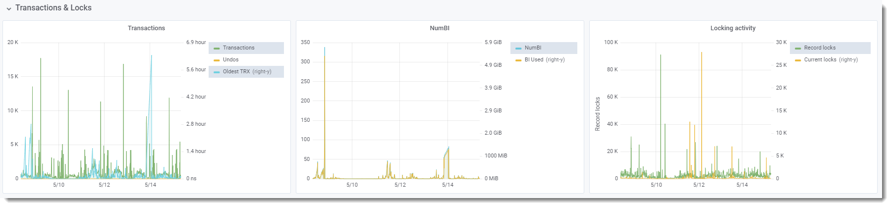These graphs provide detailed historical data on transactions, record locking, and BI activity. See the Dashboard View page for descriptions and in-depth discussions on the metrics in these panels.