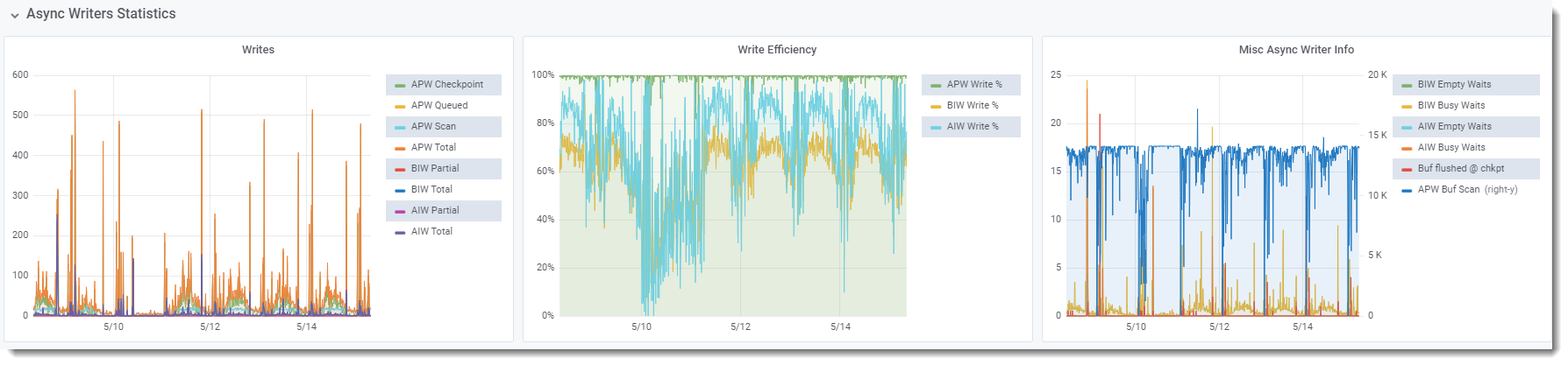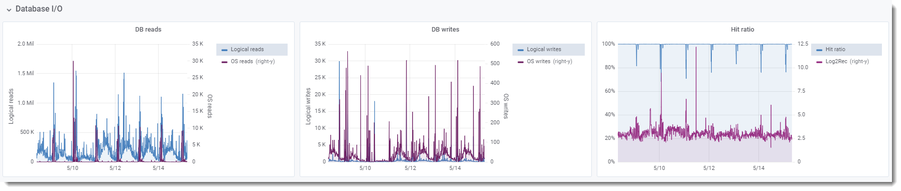 These graphs show the interplay of logical versus physical reads and writes, as well as the hit ratio and the logical-to-record read ratio. See the Dashboard View page for descriptions and in-depth discussions on the metrics in these panels.