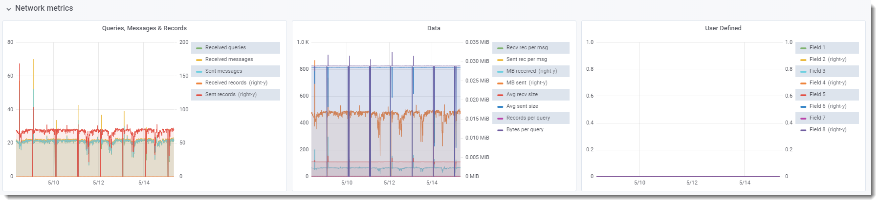 These critical metrics show how efficient data transport is across the network for applications that query the database across a client-server connection. Please see at the Server Activity page for descriptions and in-depth discussions on the metrics in these panels.