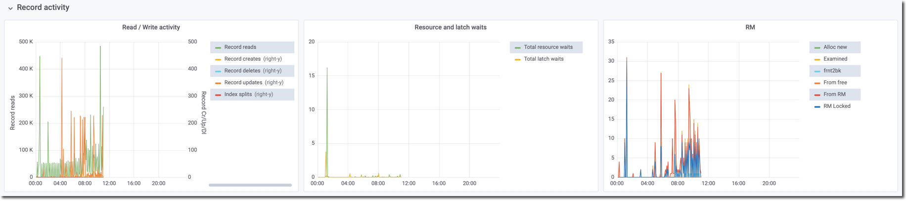 These graphs show detailed historical data for Record Read/Write, (database internal) Resource and Latch Wait and RM chain activity. See the Dashboard View page for descriptions and in-depth discussions on the metrics in these panels.
