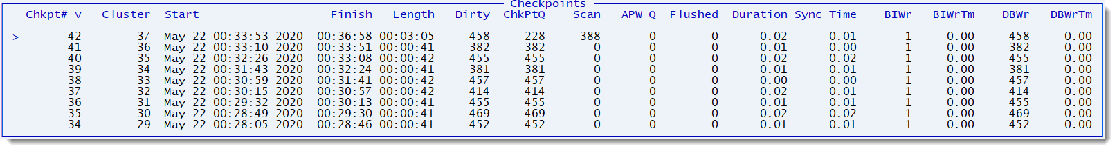 This panel shows detailed information on the last x checkpoints, where x is 8 for older versions of Progress and 32 for 11.7+. Also, as of 11.7, the number of checkpoint statistics in memory is configurable via the -numcheckpointstats startup parameter.