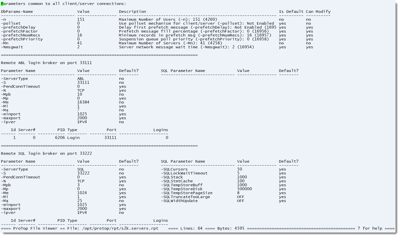 This option automatically generates $PROTOP/rpt/ .servers.rpt and displays it in the ProTop File Viewer. The report displays global and broker-specific parameters for client/server brokers.