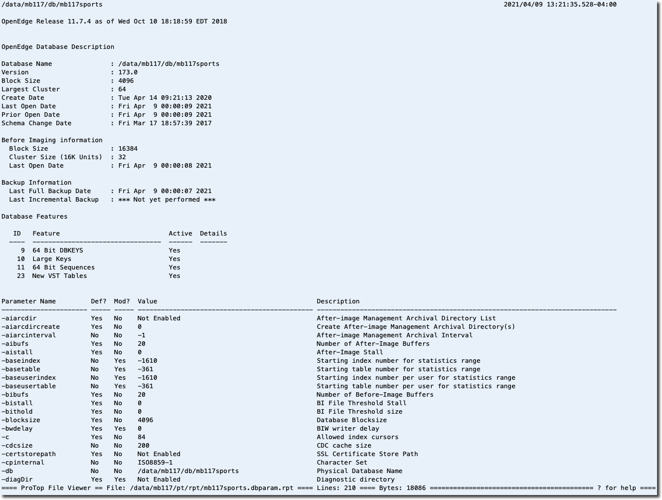 See the ProTop File Viewer page for instructions on how to navigate in the file viewer or hit '?' to bring up a help panel. 'x' or 'q' will exit the report display and return you to the previous screen.