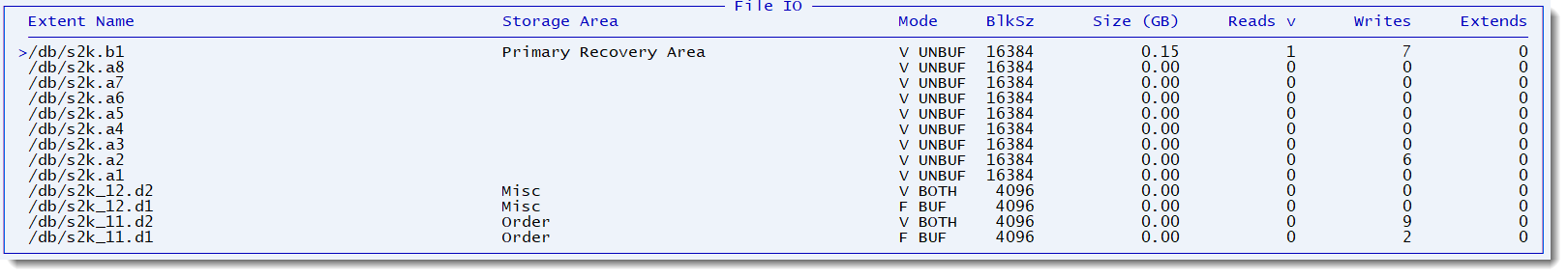 This screen shows IO to the various database files. Note that in a well-tuned system, there should be very little read activity from the data files as we expect the working set of data to already be in the database buffer cache.