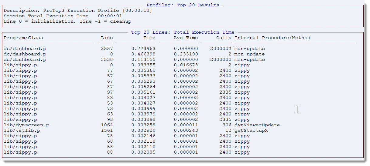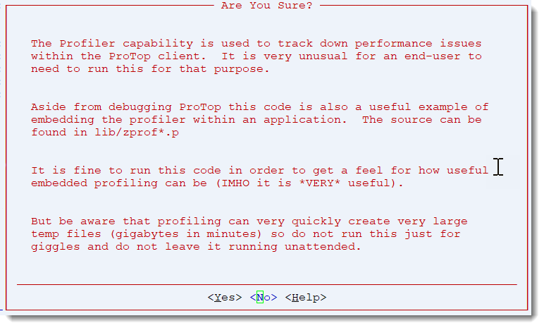This screen and the accompanying programs (lib/zprof*) are meant to provide an example of how to use the OpenEdge profiler. No useful data related to the attached database is generated.